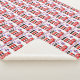 Such a cute design in red white and blue; London theme with little Buckingham Palace Queen's Guards standing in a row; under Union Jack Bunting flags, London text with the famous London Eye symbol and a big red double decker bus. A very British fun design.