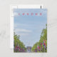 A beautiful view of the Mall in London lined with Union Jack flags and Buckingham Palace in the background printed on a postcard.