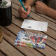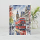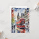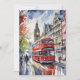 This postcard features a watercolor portrait of a double decker bus in London, England.