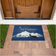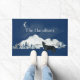 Blue front door mat, with graphics of a lone wolf howling at the moon with mountains in the background. Personalise the custom text to suit your needs.