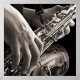 This extremely detailed hyperrealist oil painting by Jeff Bartels depicts a man playing a saxophone. The closely cropped, black and white image features the man's left hand in the foreground with his left hand up in the background. Strong light and shadows along with the tight cropping gives this painting a striking and dramatic feel.