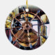 Skyline of Long Beach, California at dusk on the front side of this two sided ornament. A graphic detail image of the steering wheel on the Queen Mary ship on the back. Change the year date to the year of your choice.