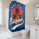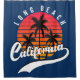 Long Beach shower curtain with a retro design that features a sunset and palm trees on Old Glory Blue customisable background colour. This design also has California in a handwritten font with a swash tail glyph for that stylish retro look. This shower curtain is just for you if you are from Long Beach or you can get as a gift or souvenir for someone.