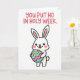 This card shows a simple digital illustration of a white, long-eared bunny-like character 🐰 standing upright against a plain white background. It has tiny black dot eyes, round rosy cheeks, and an open smile with a small tongue showing, giving it a sweet, friendly look that feels like it’s meant for someone close. The character holds an oval egg in a gentle hug, as if cuddling a small gift for a friend or someone it adores. The egg is decorated with flowing, wavy bands of pastel blue, soft pink, and sunny yellow, adding a springtime touch 🌷. Near the top, a short message sits above the character in rounded bubble-style letters, colored bright pink. The text is centered and spaced so it feels like it’s speaking directly to the bunny below, adding a light, teasing warmth to the scene. The bunny’s cheeks are a soft pink, and the patterned egg shows curved stripes in blue, pink, and yellow on the white background.