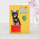 This adorable little black and tan long-haired Chihuahua sends happy wishes for the dog mom or dog lover's birthday while wearing a birthday hat and sitting among balloons and confetti.
