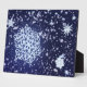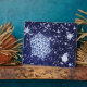 A 3D close-up of a snowflake against a background of falling flakes in a dark winter night sky.