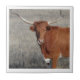Photograph of a longhorn cow standing in dry grass and licking her nose.