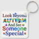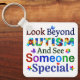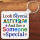 Inspirational quote of “Look Beyond AUTISM And See Someone Special” with colourful Autism puzzles to support autistic children and their families.