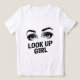 A bold and empowering graphic featuring a close-up of striking blue eyes with long lashes and arched brows, framed by dramatic grey eyeshadow. Below the gaze, the phrase 'LOOK UP GIRL' is written in distressed black lettering, creating a sense of attitude and confidence. This design inspires strength, awareness, and a reminder to rise above — perfect for apparel, posters, or motivational merchandise.
