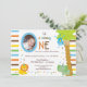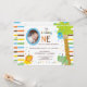 Upload your own photo and customise the text on this adorable Baby's First Birthday photo invitation. Brown, blue, yellow orange and green stripes are the background accent to this whimsical animal themed design. There is a monkey hanging from a tree, a lion and an elephant all wearing colourful polka dot birthday hats. Text reads: BABYNAME is turning ONE". The "O" in one serves as the frame for your own baby's photo. There is plenty of customisable text for you to add your party information. The reverse side of this colourful design features the same characters excluding the party text.