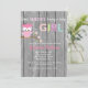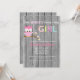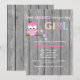 Look Whoo's having a baby girl! Celebrate the Mother To Be with this trendy yet adorable invitation. It has a grey wood grain background. Along the top is a branch with a cute pink owl perched on the branch that has flowers on the end. It has "GIRL" is colourful striped font letters. Personalise with your party information in the centre. This invitation is completely customisable.