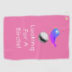 "Looking For A Birdie" with colourful bird, golf ball art and white text. Personalise this Golf Towel with your message and laugh your way around the links. Comes in several colours. Golf ball and bird art can be removed or placed in another location on the design. Pink background.
