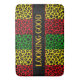 Rasta flag coloured red, yellow and green leopard print bathroom bathmat. Across the middle is the quote 'LOOKING GOOD' which is customisable so you can add your own wording, or delete if you prefer