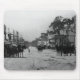 Horses, carriages, and pedestrians are seen as