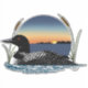 A loon on a lake with a sunset and cattails in a backdrop of blue