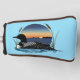 A loon on a lake with a sunset and cattails in a backdrop of blue