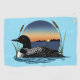 A loon on the lake with a sunset and cattails in a backdrop of blue