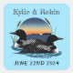 A pair of loons on the lake with a warm sunset behind them, all set against a blue backdrop