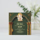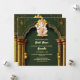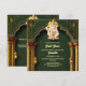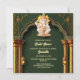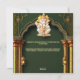 A beautiful ivory and gold three dimensional Lord Ganesh statue appears at the top edge of this invitation set against a dark green and gold background. The dark green background is framed by a regal golden arch and pillars on which small lanterns hang. White text templates for your custom wording appear on both the front and the back. The back of the invitation has the same design and the templates, if not required, may be deleted. This stylish, elegant and traditional design is ideal for any Hindi or Hindu ceremony. Spoil the bride to be with this ethnic asian upmarket, luxurious and bespoke square invitation