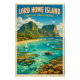 Travel poster featuring Lord Howe Island, Australia, in a classic retro travel-poster style. Central focus on the dramatic twin volcanic peaks of Mount Gower and Mount Lidgbird rising above a crystal-clear turquoise lagoon, with coral reefs, white sand beaches, and lush subtropical forests surrounding the island. A few small boats drift on calm waters under bright Pacific sunlight, creating a pristine and remote paradise atmosphere. Vibrant color palette of lagoon turquoise, emerald green mountains, coral reef blues, and warm sunlit gold. Clean graphic illustration with subtle vintage grain texture. Bold vintage typography headline: “LORD HOWE ISLAND – AUSTRALIA’S HIDDEN PARADISE”. Vertical 2:3 layout, high-resolution, print-ready.