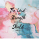 This image features a comforting scripture quote displayed over a beautifully marbled background, with flowing patterns of pink, teal, white, and gold accents. The elegant black script reads, "The Lord IS MY Strength AND MY Shield," with the reference "PSALM 28:7" at the bottom. The blend of serene colours and a powerful message creates an uplifting and reassuring spiritual piece.