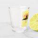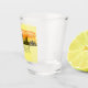 Shot glass features Los Angeles California city skyline silhouette with sunset watercolor splash and latitude & longitude coordinates on pale yellow background.