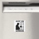 Funny political gift refrigerator magnet for garage beer fridges in the progressive man cave. Black graphic of a portly and corrupt Donald J Trump going to prison for all his crimes. "Get in loser".