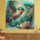 The vibrant hummingbird—painted with rich textured strokes—emerges from turquoise waters and soft blooming florals, creating a beautiful contrast between freedom, mystery, and resilience.