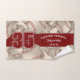 This cool towel for baseball or softball players features varied size, realistic, used-looking baseballs turned every which way on a customisable off-white background and prominent jersey number in dark red overlying a bold, full length dark red colour strip, upon which you can also personalise the athlete's name, team name & mascot name - by katz_d_zynes
