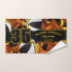 This team spirit towel for basketball players features varied size basketballs with black & gold team colours turned every which way, overlying a customisable basketball-orange background, and prominent jersey number in black overlying a full length black colour strip, upon which you can also customise the athlete's name, team name & mascot name in gold - by katz_d_zynes