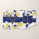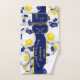 This team spirit towel for soccer players features varied size soccer balls with blue & gold team colours turned every which way on a white background and prominent jersey number in blue overlying a full length blue colour strip, upon which you can also customise the athlete's name, team name & mascot name in gold - by katz_d_zynes
