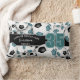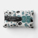 This team spirit lumbar pillow for a soccer player features varied size soccer balls with teal & black team colours turned every which way on a white background and prominent jersey number in teal overlying a full length black colour strip, upon which you can also customise the athlete's name, team name & mascot name in white - reverse side of pillow has a larger version of the soccer balls pattern overlying a teal background - by katz_d_zynes - similarly styled hand towels for soccer players can be found in katz_d_zynes' Team name soccer towels & water bottles collection >>>>>> https://www.zazzle.com/collections/119856912745827517