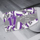 This team colours towel for volleyball players features varied size purple, grey & white volleyballs turned every which way on a white background and prominent jersey number in purple overlying a bold, full length grey colour strip, upon which you can also personalise the athlete's name, team name & mascot name - by katz_d_zynes