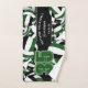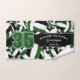 This team colours towel for volleyball players features varied size green, black & white volleyballs turned every which way on a white background and prominent jersey number in green overlying a bold, full length black colour strip, upon which you can also personalise the athlete's name, team name & mascot name - by katz_d_zynes
