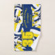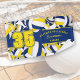 This cool towel for volleyball players features varied size blue, gold & white volleyballs turned every which way on a white background and prominent jersey number in gold overlying a bold, full length blue colour strip, upon which you can also personalise the athlete's name, team name & mascot name - by katz_d_zynes