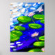 A vivid and serene painting capturing a peaceful aquatic scene. Bright green lily pads float gently across a deep blue and purple water surface, punctuated by blooming pink lotus flowers on slender stems. The background features expressive brushstrokes in white, blue, and light brown, evoking the shimmering reflections and gentle movement of water. The composition blends realism with abstract expression, creating a calming and visually rich portrayal of nature’s elegance.