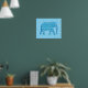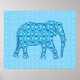 Mixed media digital graphic of an elephant against an arabesque tiled background - turquoise, dark indigo blue and white lotus flower pattern against an aqua background