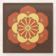 Japanese mandala design glass coaster that depicts a stylised lotus flower, symbolising purity, spiritual awakening and faithfulness - flower in rust orange / terracotta and golden yellow, accented with tan, on a dark chocolate brown background