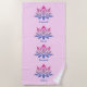 This large beach towel has a soft pink background color. The design features four large blue-pink lotus flowers each has a separately editable caption. Or you can use the BREATHE RELAX BALANCE SMILE shown. (Edit this text for your own preferred wording).