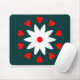 An attractive lotus motif surrounded with love hearts on a dark green background.