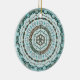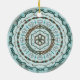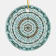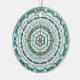 This concentric circle mandala features layers of white, turquoise and brown patterns inspired by Celtic weaves and Indian henna, such as vines, ribbons, and lotus flowers.