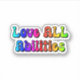 A rainbow retro typography design with the words "Love ALL Abilities" to support and promote neurodiversity awareness and autism acceptance.