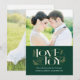 This elegant Christmas card features the greeting "Love and Joy" in hand lettering and embellished with hand drawn pine boughs. Add a full bleed wedding photo to the back of the card, or click on "customise it" to edit the background colour to match your photo.