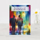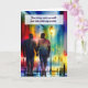 A very handsome and loving African American gay couple walk together in a light rain along an abstract rainbow city sidewalk on this tender and romantic card to say I love you.