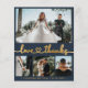 Budget Modern Elegant Gold Heart Font Script Wedding 4 Photo Collage Affordable Thank You Paper. Stylish minimalist wedding card template featuring four (4) grid photo collage on the front and one (1) photo on the reverse side. "Love and thanks" text in a cursive hand written calligraphy cute heart font script with swash tail in gold on navy blue background. Personalise with your name and thank you message. If You need help or matching item, please contact to designer!