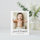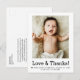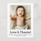 Share your joy with this Love and Thanks Baby Photo Birth Announcement, featuring one cherished photo, your baby’s name, and a customizable heartfelt message—perfect for announcing your little one’s arrival and expressing gratitude. Typewriter style typography makes this card timeless.