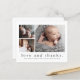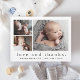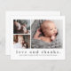 A sweet 3 photo collage birth announcement and thank you card featuring simple modern type and 3 pictures on the front. The back has a large full name header and personal message from the family. Click the edit button to customise this design with your photos and details.