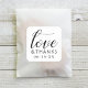 Modern and chic black and white wedding "Love and Thanks" favour stickers feature a stylish black typographic design with bold calligraphy script and elegant custom wedding date text that can be personalised.