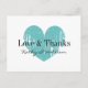 Love and thanks postcard with vintage heart. Aqua / Turquoise blue faded heart wedding thank you cards. Romantic design with weathered love symbol. Perfect for summer beach theme or rustic country chic marriages. Elegant script typography design personalised with name of bride and groom. Pretty and unique icon graphic.