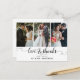 Elegant modern wedding thank you postcard features 3 wedding photos in a collage layout, with "love & thanks" calligraphy script in black on white background. Personalize with your names, and add a custom thank you message and signature to the back.